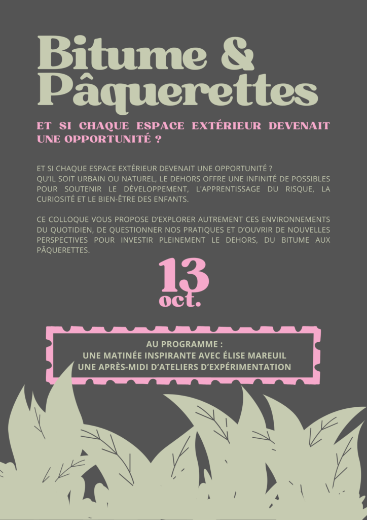 Ce colloque vous propose d’explorer autrement ces environnements du quotidien, de questionner nos pratiques et d’ouvrir de nouvelles perspectives pour investir pleinement le dehors, du bitume aux pâquerettes.